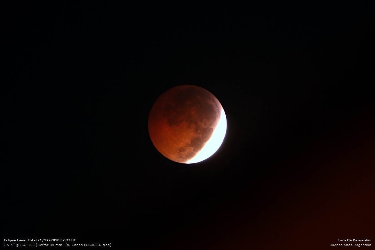 Imagen del eclipse total lunar del 21 de Diciembre de 2010 capturada desde Buenos Aires. Se utilizó un telescopio refractor Orion de 80 mm F/5 sobre montura ecuatorial, y cámara Canon EOS 300D, ISO-100 y 4 segundos de exposición.
