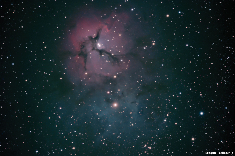 Imagen de M 20, la Nebulosa Trífida, obtenida con un telescopio Meade LX200R a F/10, utilizando una cámara CCD Starlight Express SXVF-M25C (OSC 18x180s) el 7/07/2008.