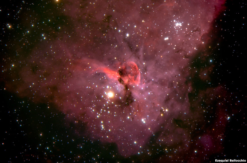Fotografía de la Nebulosa de Eta Carinae (Keyhole Nebula) tomada con un telescopio Meade LX200R 10" a F/6.3 utilizando una cámara CCD SBIG ST-10, compuesta de 30 tomas de 20 segundos con cada filtro LRGB, sumando un total de 120 imágenes en 40 minutos de exposición. Procesado con Maxim DL (calibración, apilado y combinación LRGB), PixInsight LE (DBE) y Photoshop (histogramas y curvas)
