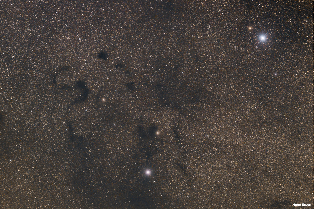 Imagen de la nebulosa oscura Barnard 72, obtenida desde cielos urbanos en dos sesiones que suman más de 3 horas de exposición utilizando un telescopio SW ED 80 y cámara Canon 40D modificada con filtro clip CLS/CCD. Guiado off axis con cámara Lodestar SX.