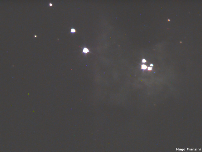 Primer imagen obtenida utilizando una cámara Meade DSI en un telescopio reflector de 180 mm de apertura y 1000 mm de focal sobre una montura LDX-75. Toma única de 4 segundos utilizando un barlow 2x. Pueden distinguirse las 4 estrellas que forman El Trapecio.