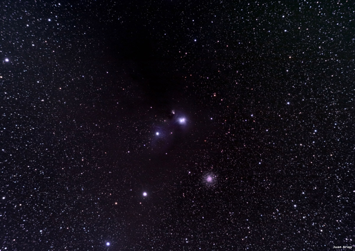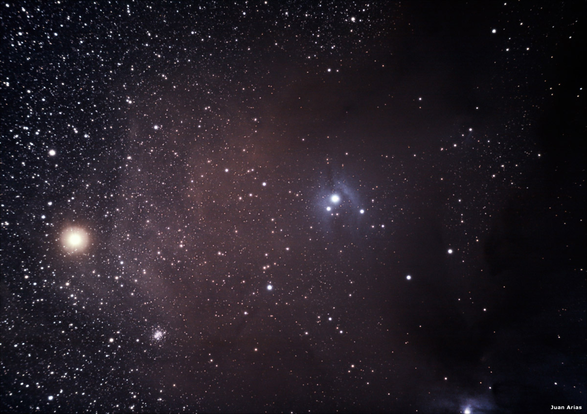 Imágenes de Juan Arias. Zona de rho Ophiuchus, incluyendo a la estrella Antares y la nebulosa de reflexión IC 4605, compuesta por 70 tomas de 90 segundos a ISO-1600 obtenida con una cámara Canon 40D y telescopio William Optics 66 Apo. La imagen de NGC 6726 se compone de 45 tomas de 120 segundos, guiado con Meade SN 6".
