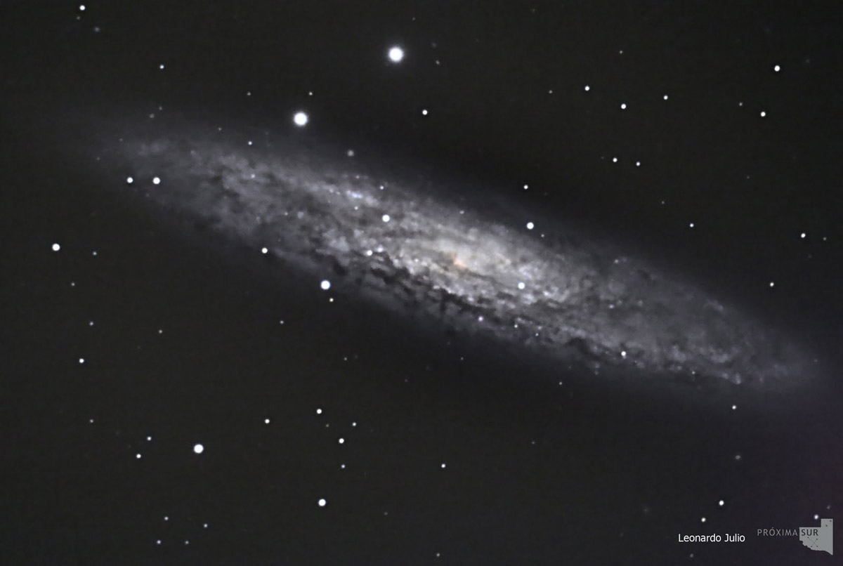 Imagen de la Galaxia de Sculptor, NGC 253. Fotografiada a F/10 con un telescopio Meade LX-90 en 30 tomas de 300 segundos a ISO-800 utilizando una cámara digital Canon EOS 350D. Imagen en formato completo y más datos disponibles en Astronomía Pampeana.