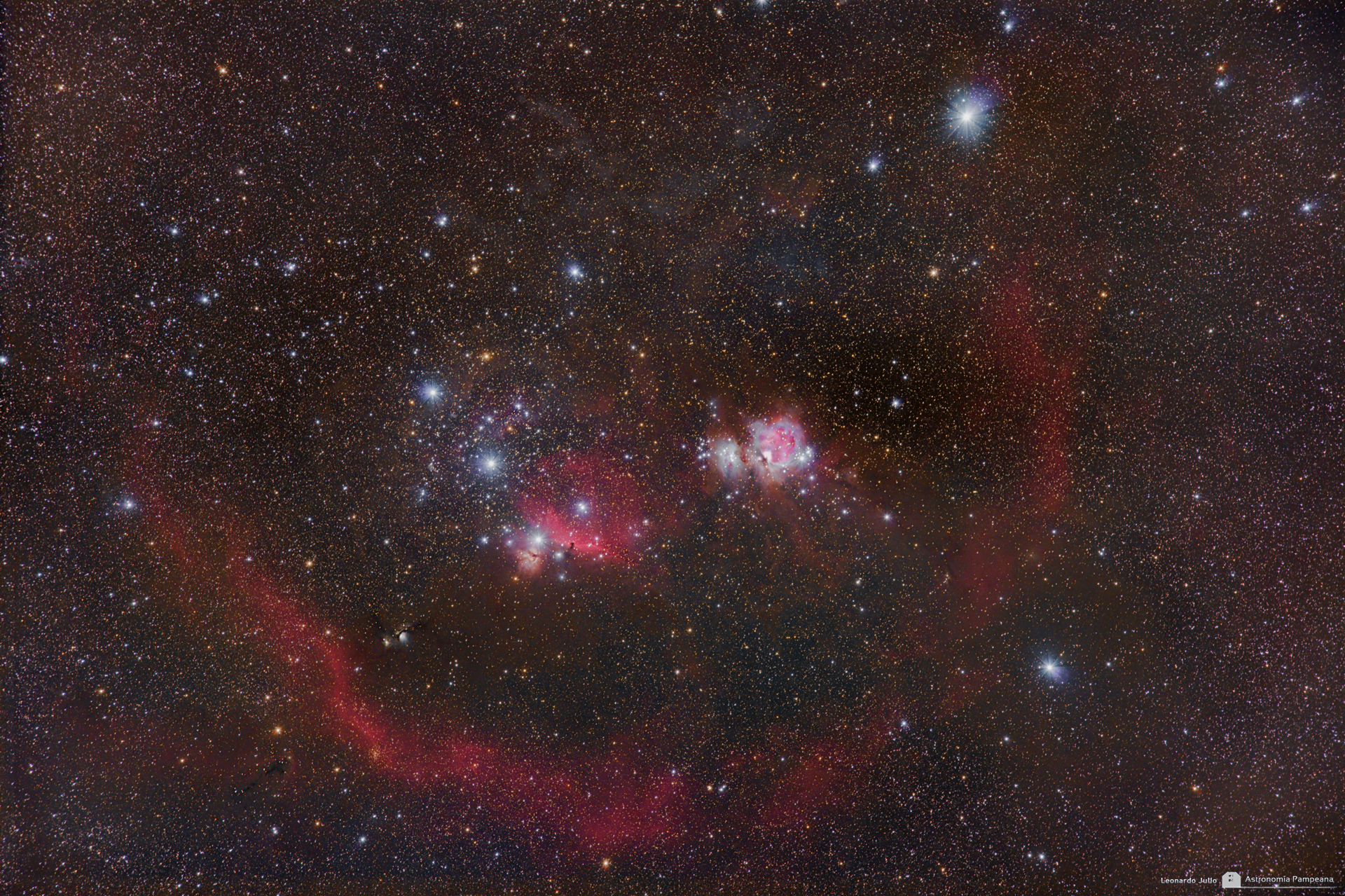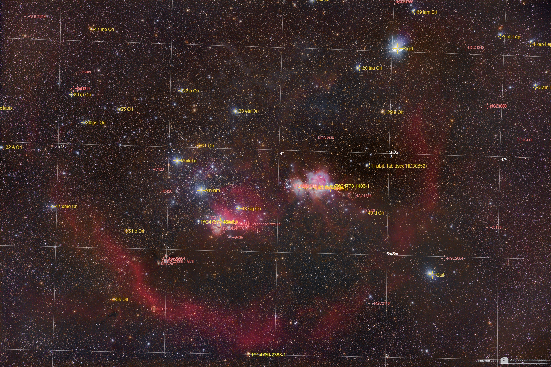 Imagen lograda con un lente Canon 24-105 a 105 mm con cámara Canon 5D Mark II Hutech. Compuesta de 67 imágenes de 3 minutos a ISO-1600. Al centro de la foto puede verse a la Nebulosa de Orion (M 42), con el Cinturón de Orion a la izquierda. En la versión anotada se ha resuelto la imagen (plate solving con PixInsight) y anotado los objetos mas destacados de forma automática. Participaron: José Joaquín Pérez, Ezequiel Bellocchio, Daniel Verschatse, Adriana Fernández, Sergio De la Fuente e hijo, , Carlos Milovic, Alejandro Tombolini y Leonardo Julio. Mas detalles en Astronomía Pampeana.