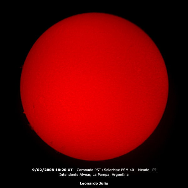 Imagen obtenida con un telescopio Coronado PST equipado con un filtro SolarMax PSM 40, alineado con el Sol sobre una montura Meade DS. Imagen capturada con una cámara Meade LPI en foco primario, procesada en Photoshop CS2. Sobre el cuadrante inferior izquierdo pueden verse varias prominencias en el borde y filamentos sobre el disco solar.