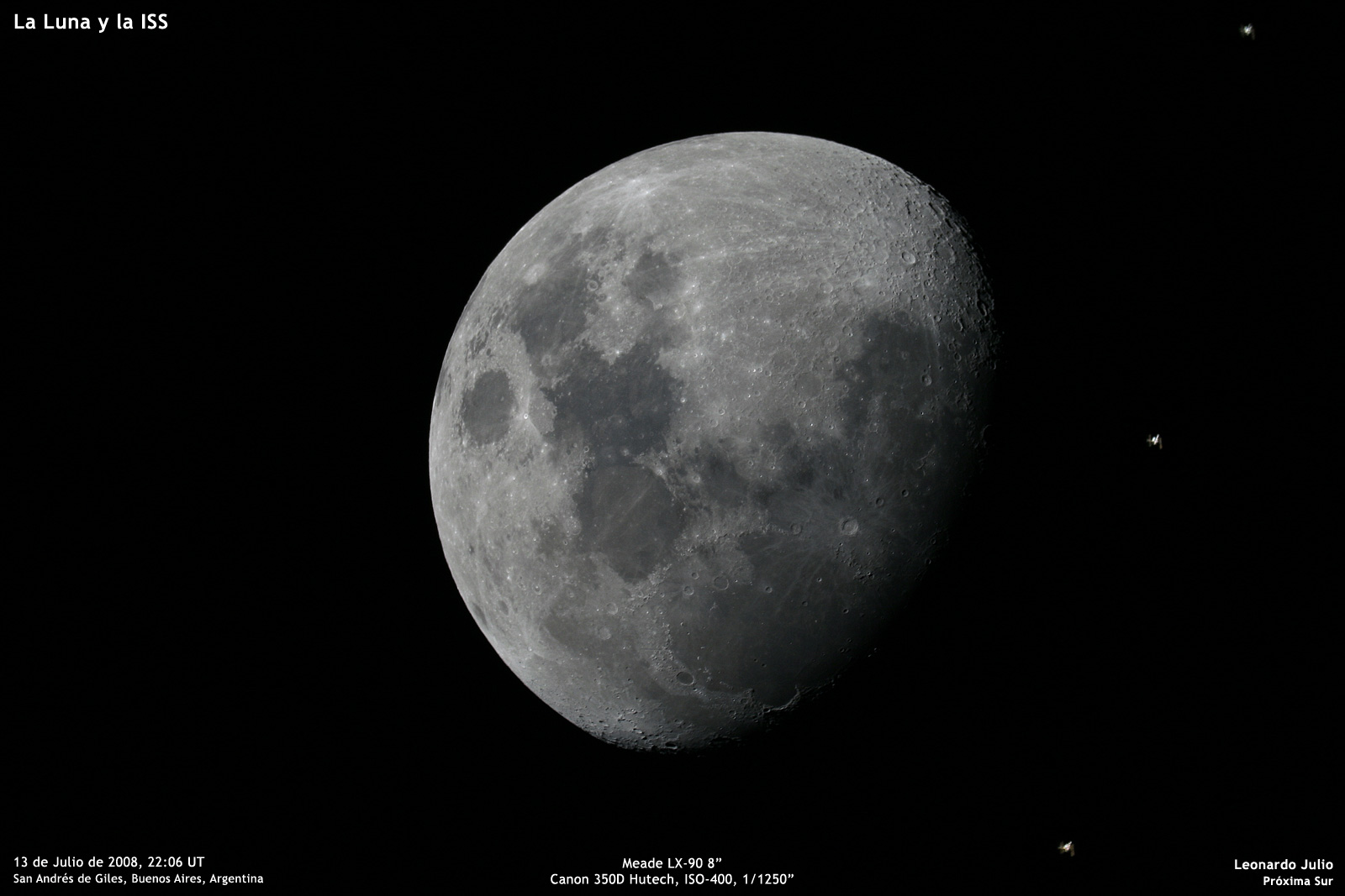 Las imágenes fueron tomadas con un telescopio Meade LX90 8", utilizando una cámara Canon EOS 350D Hutech. La ISS comenzó su trayectoria en el lado opuesto del cielo, hacia el horizonte noroeste. La vimos cruzar cercana a la estrella Acrux y luego llegar hasta la Luna donde ya preparados capturamos la secuencia de imágenes.