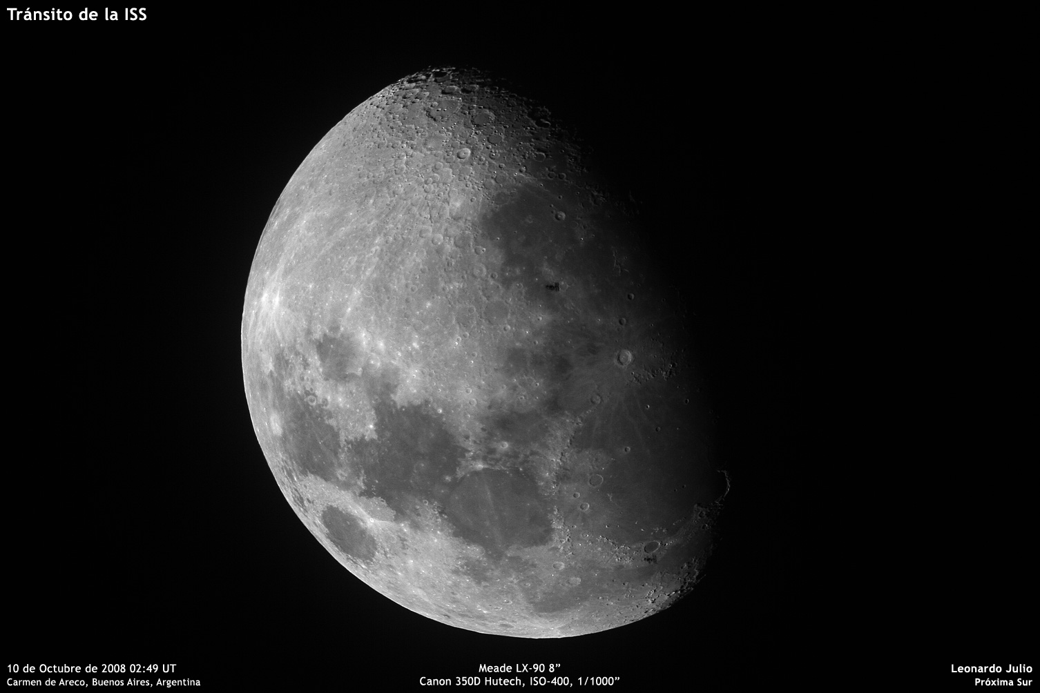 Casi tocando la medianoche del jueves 9 de Octubre de 2008 estaba previsto que la Estación Espacial Internacional (ISS) pasara por delante de la Luna, un evento denominado tránsito, que ocurre alternativamente sobre una franja estrecha donde la ubicación geográfica exacta es fundamental.