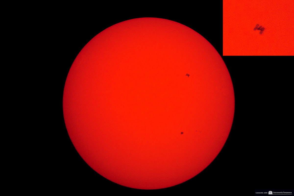 Tránsito solar de la Estación Espacial Internacional fotografiado desde la localidad de Lujan, provincia de Buenos Aires (Argentina). Participaron: Leonardo Julio y Adriana Fernandez. Imagen a resolución completa disponible en Astronomía Pampeana.