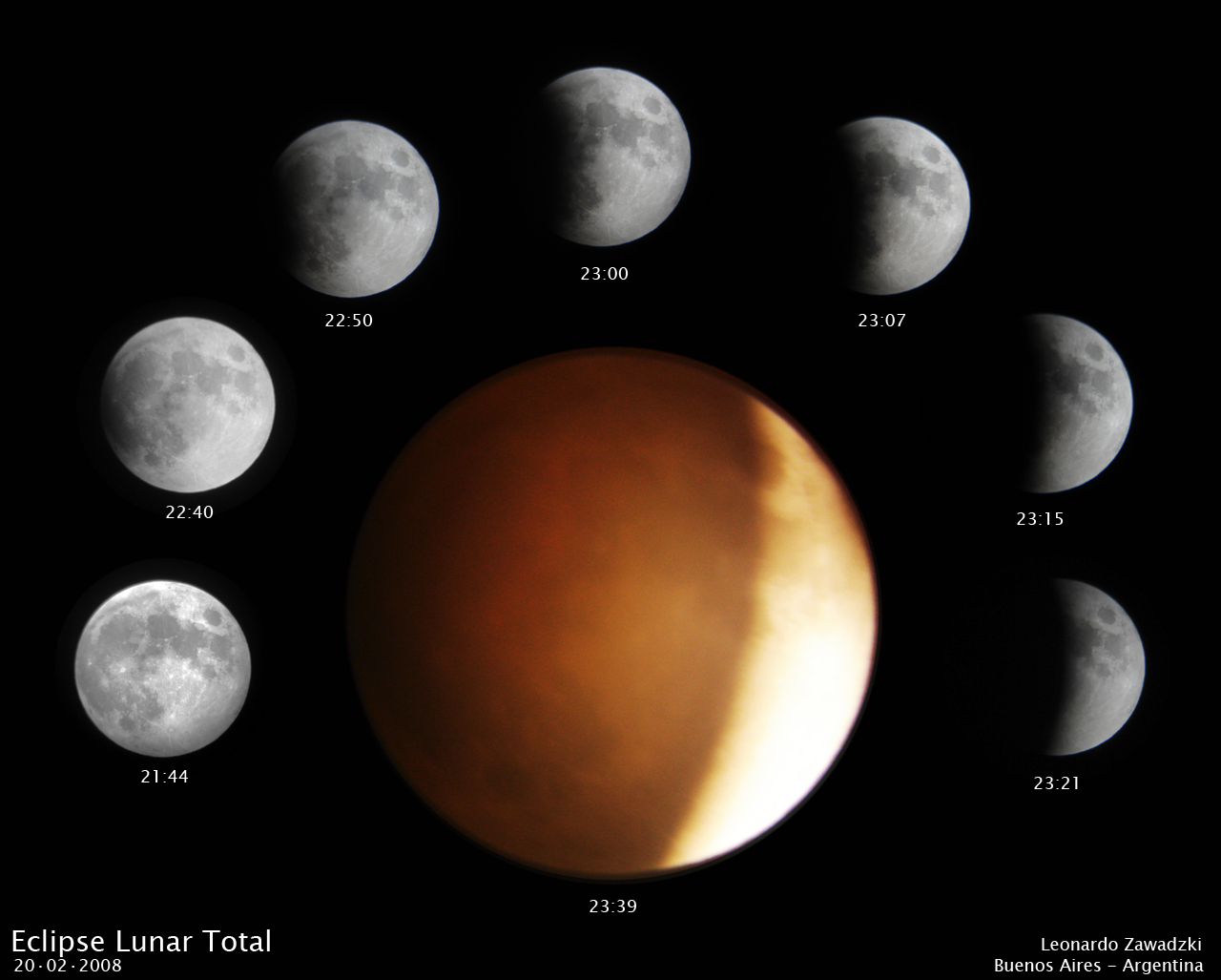 Montaje de tomas del eclipse lunar total del 20-21 de Febrero de 2008, tomadas por Leonardo Zawadzki. La imagen de la derecha muestra los horarios de cada toma.