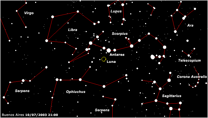 Al momento de las fotografías la Luna presentaba una fase creciente al 90 %, encontrándose a menos de 4º de Antares, la estrella principal de la constelación de Scorpius (ver mapas) La altura de la Luna sobre el horizonte era de 74º.