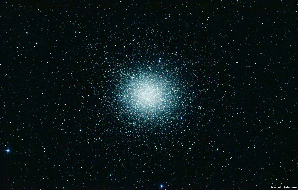 Fotografía del cúmulo globular Omega Centauri, tomado con un telescopio reflector Hokenn de 200 mm F/5 utilizando una cámara Canon EOS 400D. Compuesta de 27 tomas de 60 segundos.