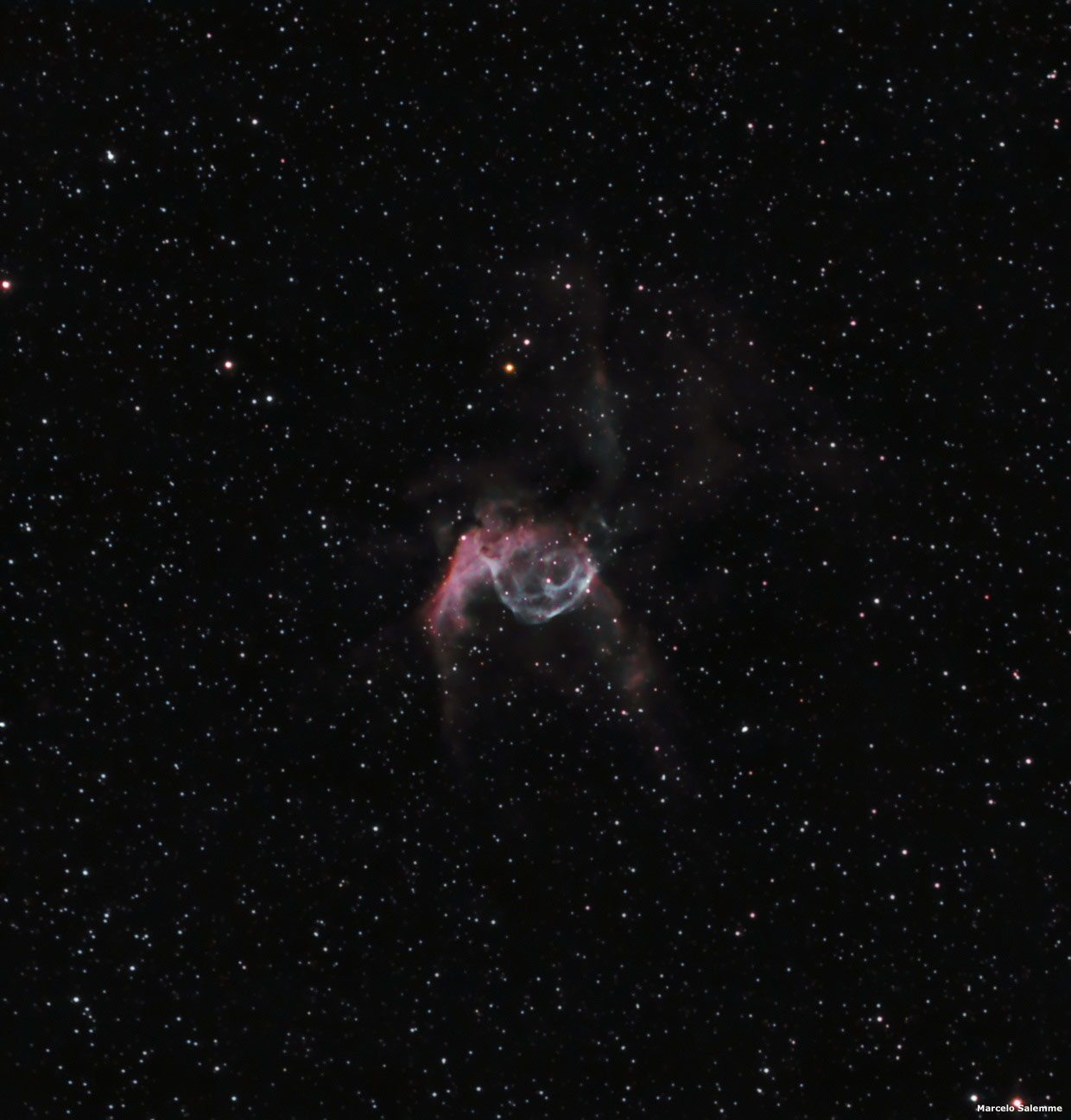 Imagen de la Nebulosa del Casco de Thor (NGC 2359) tomada con un telescopio reflector newtoniano de 200 mm F/5 utilizando una cámara Canon EOS 400D Modificada. Imagen a resolución completa en AstroMGS.