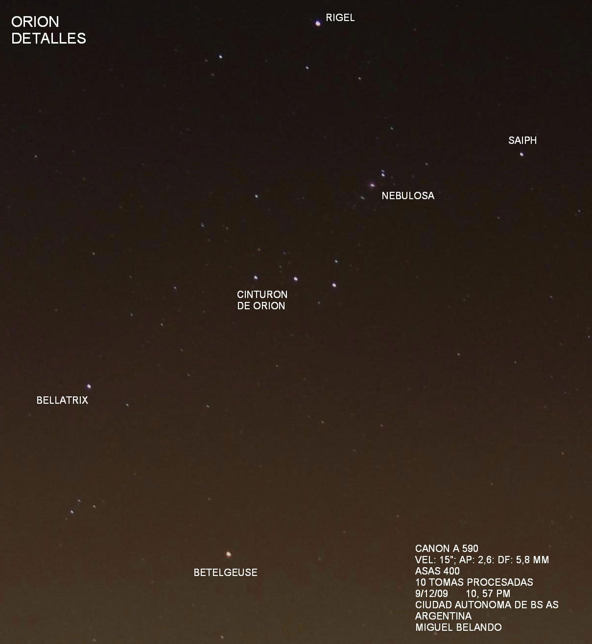 Hola!! Te felicito por las fotos. La constelación de Orión es mi favorita. Muy interesantes las leyendas o referencias que hiciste de Orión, el Cinturón y la Nebulosa. A mi me sirvió mucho, porque no sabÃa en qué parte de la constelación se encontraban. Saludos