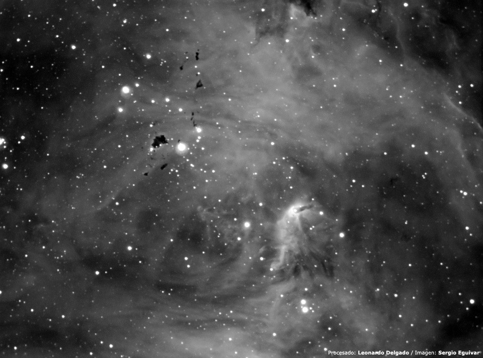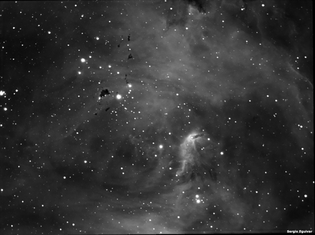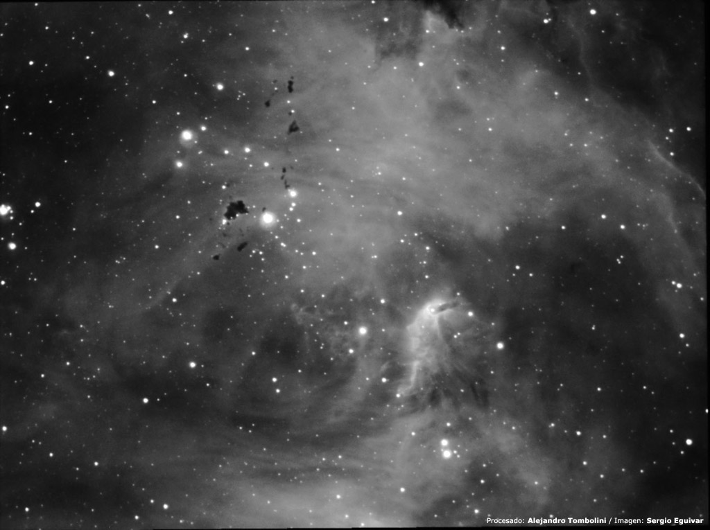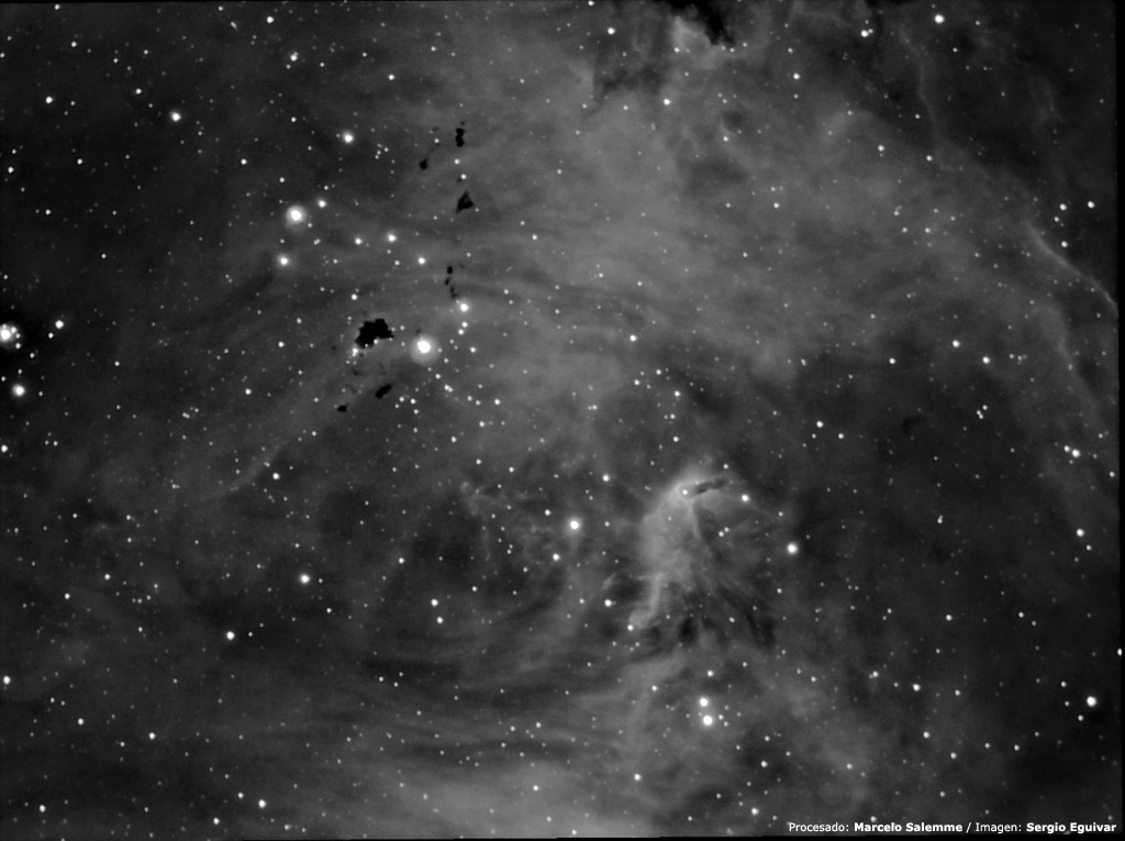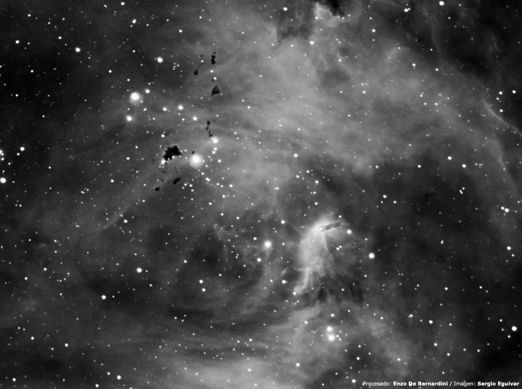 Imagen obtenida por Sergio Eguivar en H-alpha, 10 tomas de 240 segundos con un telescopio SCT C8 a F/6 de la nebulosa IC 2944 / 48 (Running Chicken Nebula, Lambda Centauri, ver imagen en color) donde pueden verse múltiples glóbulos de bok. La imagen FIT original fue procesada por Sergio Eguivar, Leonardo Delgado, Marcelo Salemme, Alejandro Tombolini y Enzo de Bernardini, como parte de una tarea destinada a compartir y comparar técnicas de procesamiento digital. Puede dejar su opinion en los comentarios de esa página.