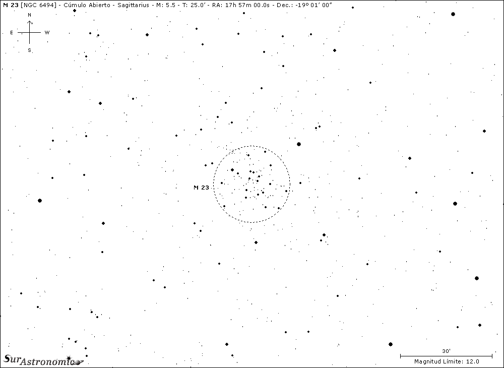 Ubicado a una distancia de 2150 años luz, M23 tiene unos