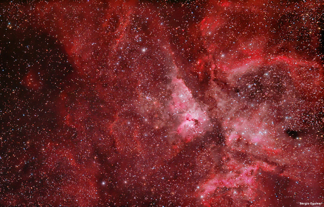 Esta nutrida estructura de HII siete veces mayor a la nebulosa de Orion, presenta una gran variedad de objetos abarcando unos 260 años luz.