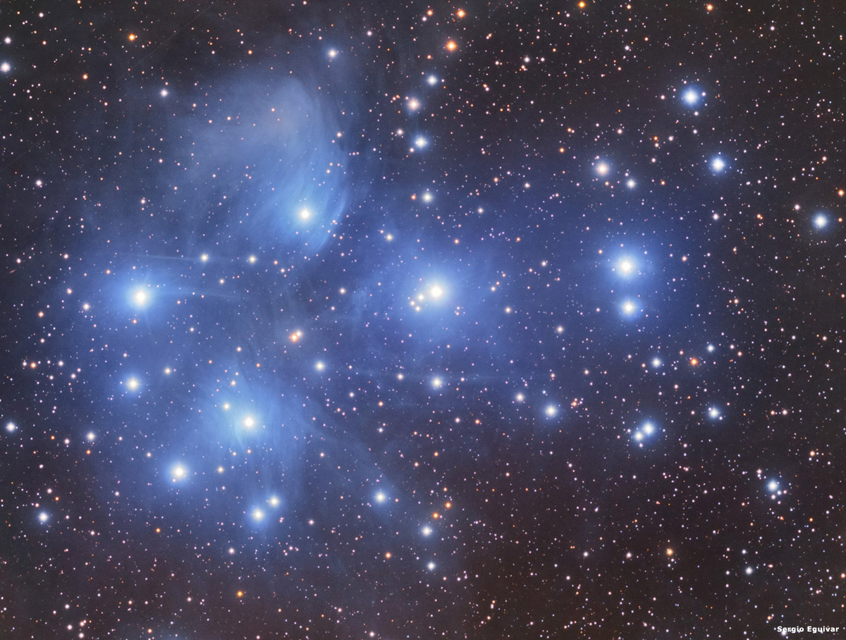 Uno de los cúmulos abiertos más atractivos del firmamento. Puede ser visto a simple vista incluso de cielos polucionados. Un buen objetivo para binoculares. Tiene un diámetro de 110 minutos de arco y brilla en magnitud 1. Se encuentra a una distancia de 380 años luz en la constelación de Tauro. Las nebulosas azuladas están compuestas por partículas moleculares de polvo que se reflejan por la luz de las estrellas brillantes. Pueden ser vistas ya que presentan una velocidad radial diferente.