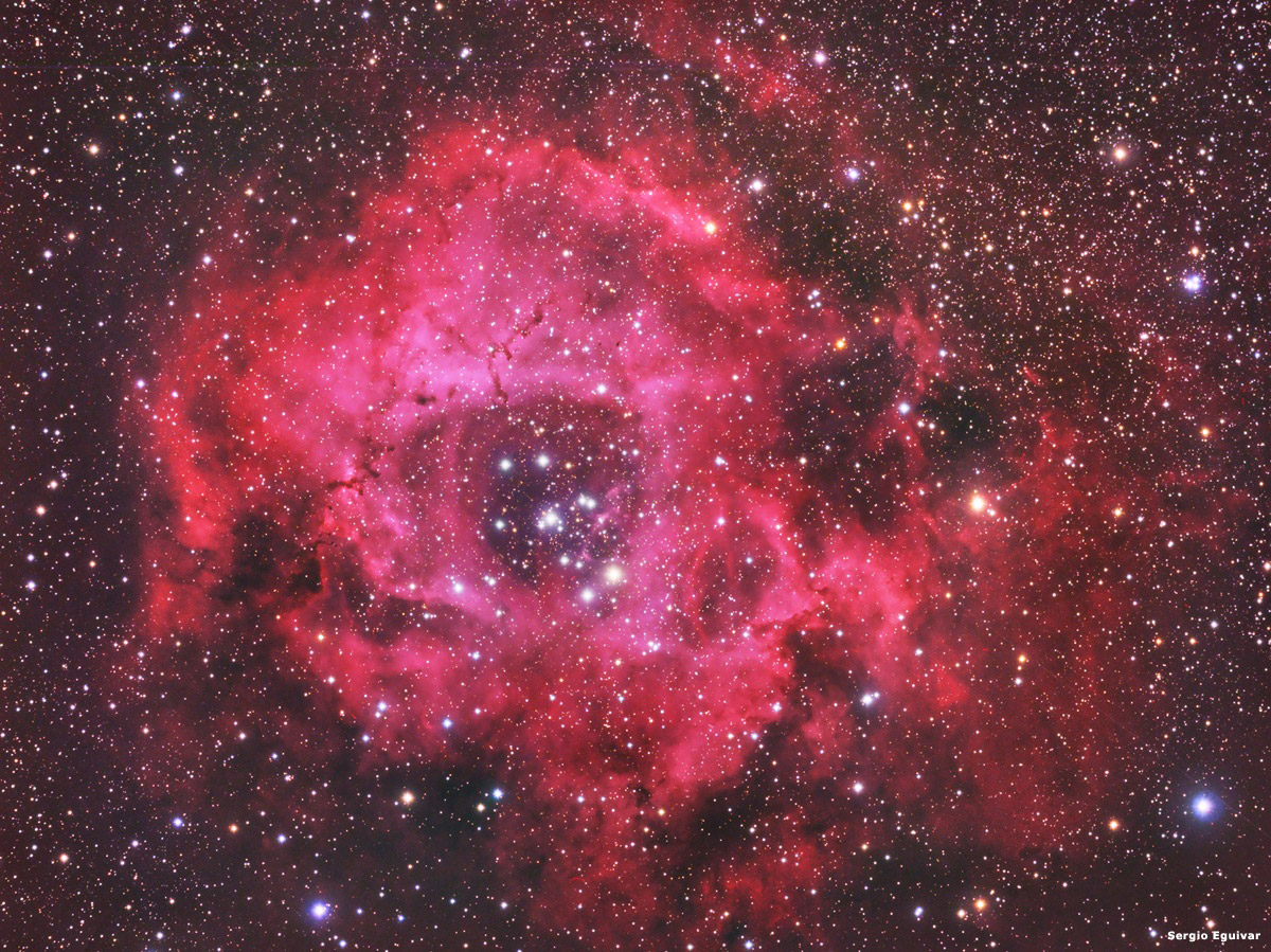 La Rosetta es un complejo de gas y polvo que se extiendo a lo largo d 50 años luz. Tiene más de un grado y en perspectiva cubre el área de 4 lunas. Ubicada en la Constelación de Monoceros a unos 5.500 años luz. El cuadro de la imagen es de aproximadamente 120 x 95 minutos de arco. NGC 2244 es el cúmulo abierto de jóvenes estrellas formadas recientemente a partir del material de la Nebulosa. El proceso de formación de estrellas sigue su curso en esta nube vasta de material interestelar.