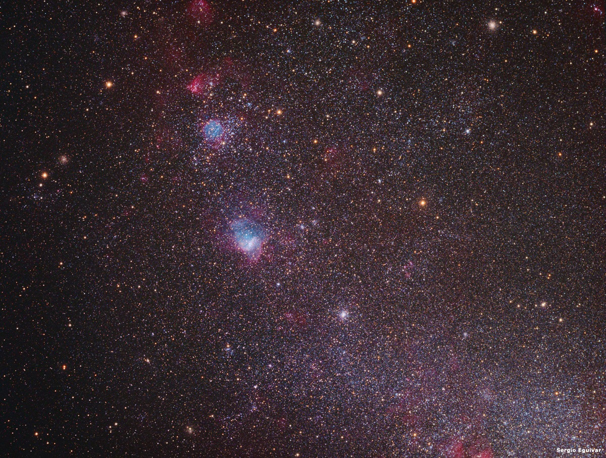 La NMeM constituye una de las vistas más sorprendentes del cielo nocturno. Es una de nuestras dos principales Galaxias satélites. Su forma irregular es debido a las fuerzas gravitacionales producidas por nuestra Vía Láctea y por la Nube Mayor de Magallanes. Muy interesante de ver la gran variedad de objetos como nebulosas y cúmulos estelares que pueden ser observados a través de telescopios de mediano porte. En esta vista parcial tenemos en el centro NGC 346 quien viene cambiando rápidamente su estructuras a través de la eras cósmicas. Esta región está expulsando gran cantidad de material interestelar y su brillo abarca un amplio espectro de color. Un poco más arriba en la imagen tenemos a NGC 371 un cúmulo abierto rodeado de hidrógeno ionizado que conforma una región muy activa de formación estelar.