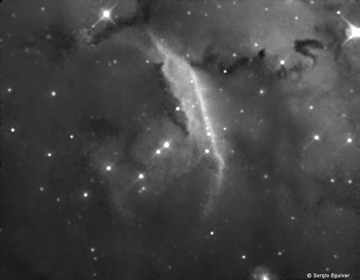 NGC 6559 Complejo de Nebulosas de Emisión y Reflexión en Sagittarius A unos 5800 años luz en la constelación de Sagitario, hemos logrado captar a NGC 6559; una pequeña e interesante región que incluye una gran variedad de objetos ubicados solamente a un grado al este del complejo de Nebulosa de La Laguna. El arco brillante del centro de la foto, juntamente con la nebulosa azulada contigua configuran NGC 6559. La nebulosa de emisión (color rojizo) contiene estrellas jóvenes y calientes en su interior. Se presume que la emisión de energía radioactiva del mencionado grupo de estrellas, ionizan los protones de hidrógeno interestelares provocando el brillo predominante en la nube. B 303 es una nebulosa oscura en forma de serpiente que se inicia justo a tres minutos de arco de la estrella más brillante en la foto SAO 186366 de magnitud 7.6. B 303 no emite luz propia, pero la podemos visualizar ya que absorbe la luz de la nube de hidrógeno un poco más distante. Su recorrido abarca 7 años luz. SAO 186366 ubicada en la foto a arriba a la izquierda refleja eficientemente pequeñas partículas de polvo configurando una azulada nebulosa de reflexión denominada IC 4685. Fiablemente GN 18.06.6.01 se encuentra abajo un tanto recortada en la foto. Es una pequeña nebulosa galáctica (de ahí la sigla GN) superpuesta sobre el complejo en una nube de Hidrógeno II.