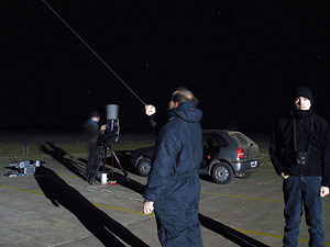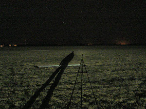 Imagen del campo del aeroclub (izquierda) A la derecha, Leonardo Julio instalando el equipo, Alejandro Tombolini apuntando el green laser hacia el cielo, y Enzo De Bernardini a la derecha de la imágen.