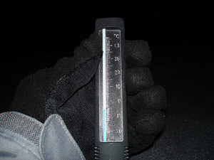 En esta foto realzada (izquierda) se puede ver el área de observación al comienzo de la sesión de observación, localizada dentro del Aeroclub Intendente Alvear. La zona de la Vía Láctea en Carina puede verse sobre los árboles. Bien entrada la noche, la marca de la temperatura llegó a los 3º C bajo cero (derecha) La escarcha blanca cubría el termómetro.