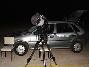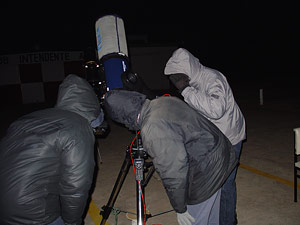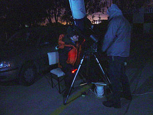 El telescopio Meade LX-90 con el que observamos cantidad de objetos del espacio profundo, posando para la foto (izquierda) con letras escritas con luz. A la derecha, Alejandro, Sebastián y Enzo, observando con el telescopio.