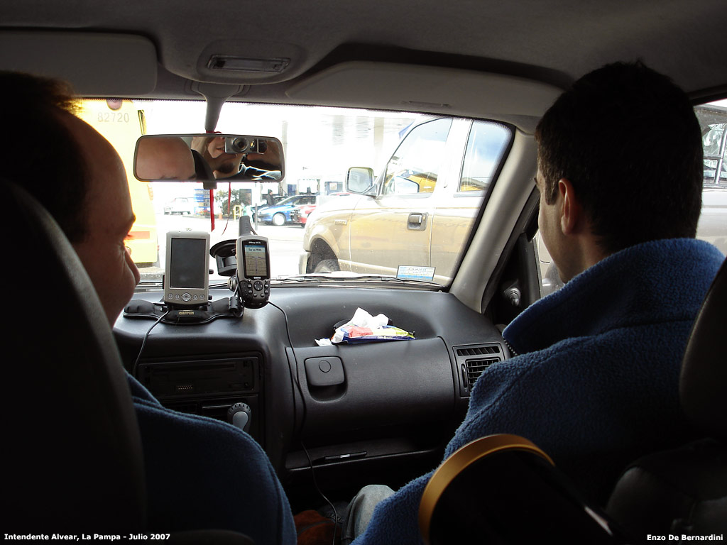 Viajando hacia Intendente Alvear el camino nos llevó a Junín, donde Gabriel Zilberman nos recibió para almorzar en su ciudad luego de un llamado telefónico desde 50 km de allí. De derecha a izquierda, Enzo De Bernardini, Alejandro Tombolini, Leonardo Julio, Sebastián Otero y Gabriel Zilberman, nuestro anfitrión. En la siguiente imagen, luego de almorzar y saliendo de Junín, Alejandro (al volante) y Leonardo.