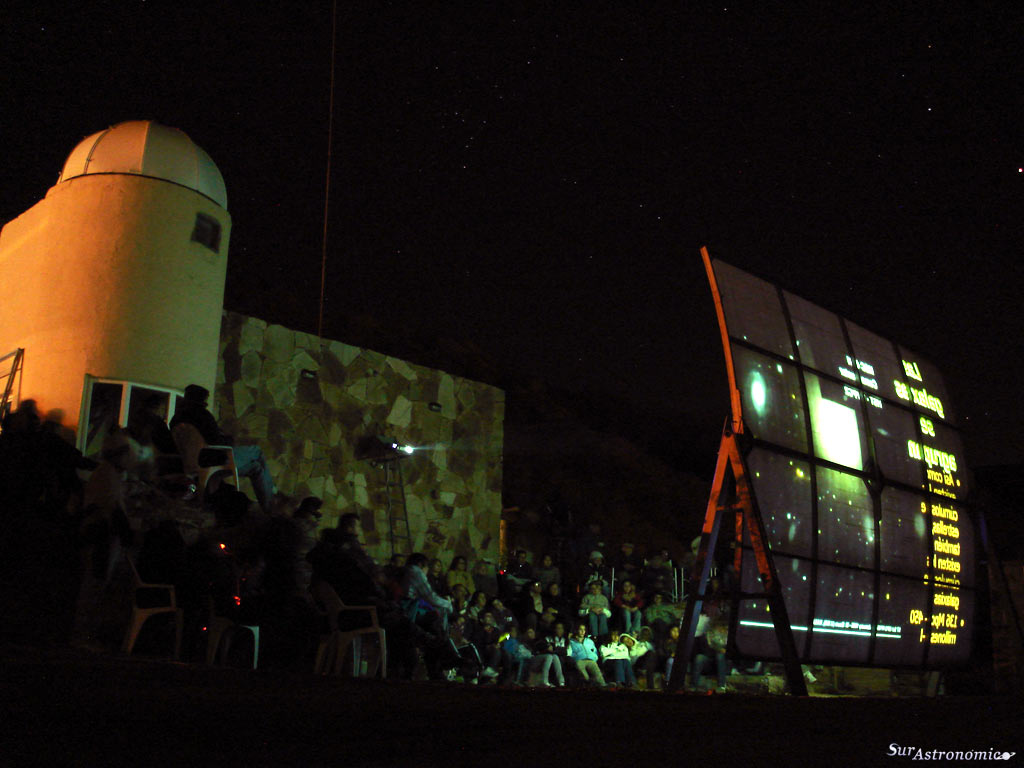 Se ha reunido una gran cantidad de gente de la ciudad de San Rafael en la observación pública programada después del atardecer del Viernes 24. En estas fotos de larga exposición podemos ver al público disfrutando de la proyección de una presentación multimedia y luego (foto de la derecha, cortesía de Alejandro Tombolini) la proyección imágenes capturadas en tiempo real con un telescopio Celestron de 11" aportado por César Brollo (Óptica Saracco). Pudimos ver varios cúmulos globulares, nebulosas y galaxias.