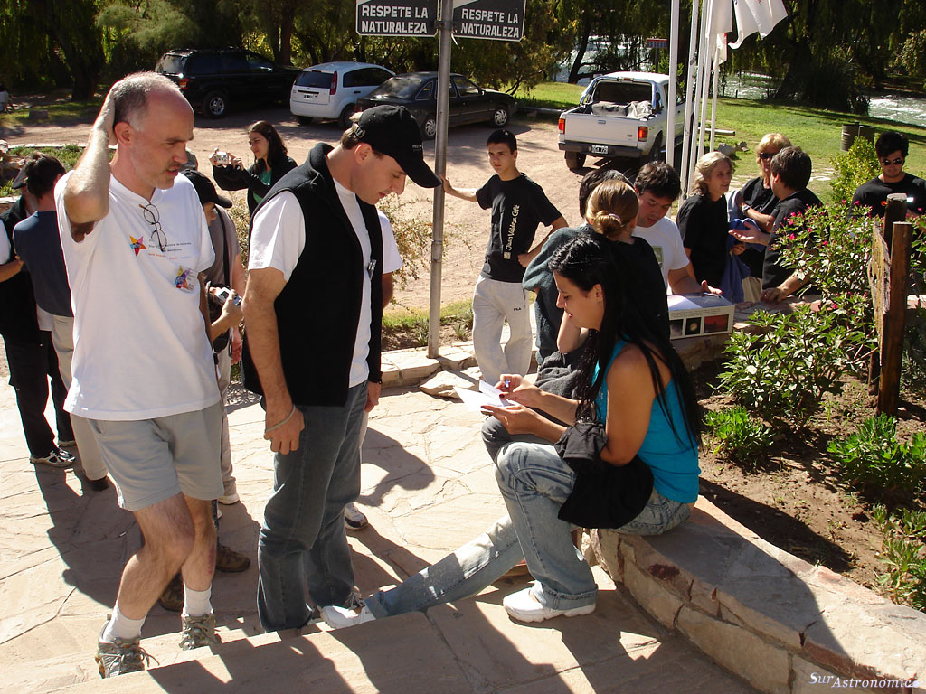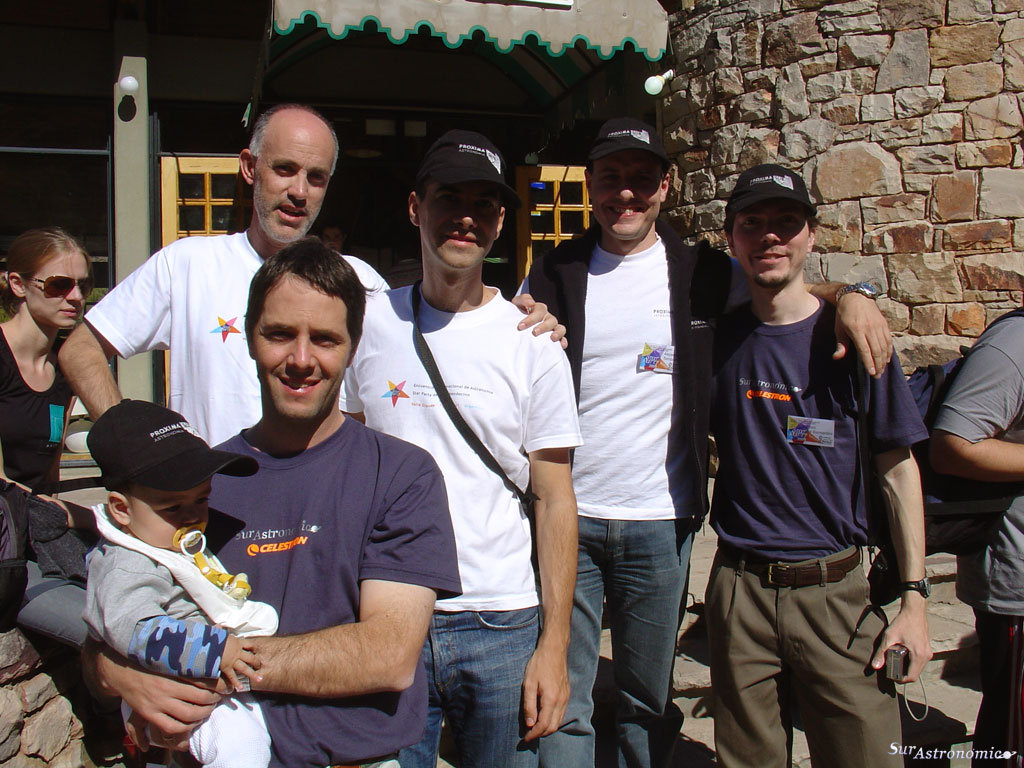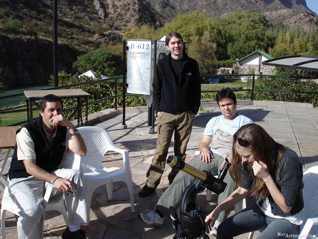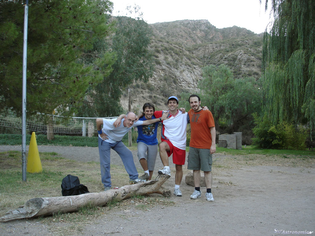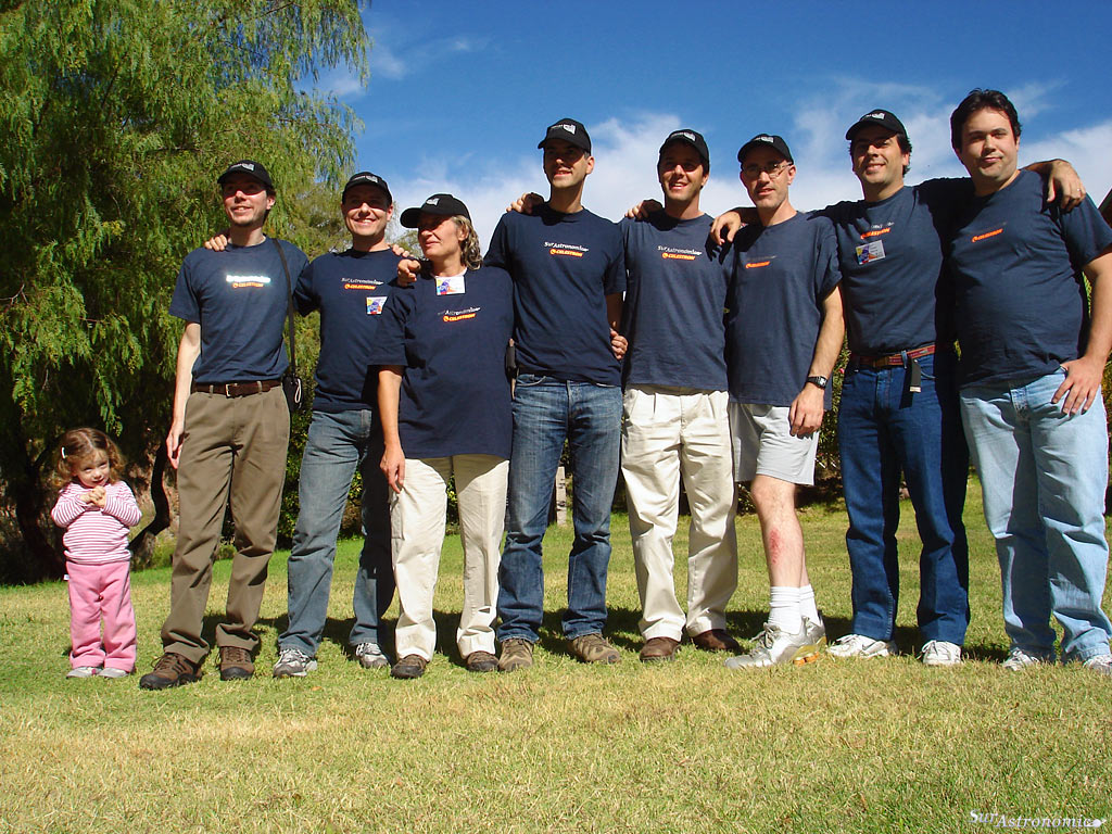 Después del almuerzo nos reunimos para una foto grupal con las nuevas remeras de Sur Astronómico. En la primer imagen nos ubicamos en la entrada del hotel. En la segunda, a orillas del río Atuel, a pocos metros. Allí se ubican: Gala Vattuone, Enzo De Bernardini, Alejandro Tombolini, Adriana Fernández, Leonardo Julio, Ezequiel Bellocchio, Sebastián Otero, Rubén Barros y Hernán Soulages. Ambas fotos cortesía de Rubén Barros.