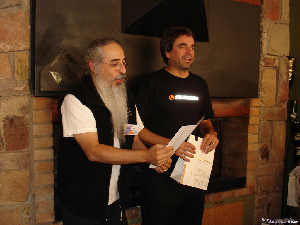 Continuando con las premiaciones y sorteos, en la primer imagen vemos a César Brollo, Jaime García y Rodolfo Ferraiuolo. Los ganadores de la maratón Messier fueron: Rodolfo Ferraiuolo con 82 objetos observados comenzando con M 41 observado con binoculares 7x50 a las 19:28 (22:28 UT), Marcelo García con 66 objetos utilizando un telescopio Celestron Nextstar de 5" y Enzo De Bernardini con 48 objetos comenzando con M 41 utilizando binoculares 15x70. Luego fue sorteado un telescopio Celestron Tabletop. En la imagen de la derecha vemos al ganador, Hernán Soulages, junto con César Brollo.