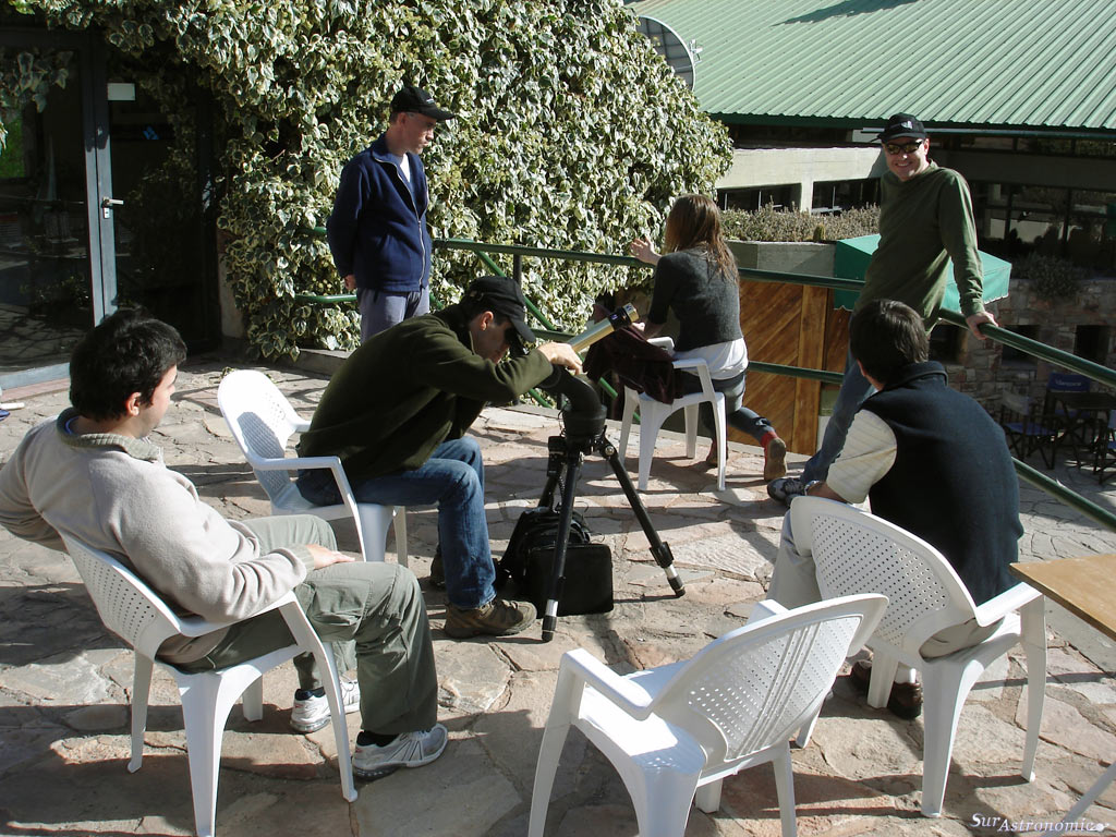 La primer actividad del encuentro, Leonardo Julio ubicó su telescopio solar Coronado bajo los cielos despejados de la mañana de Valle Grande. Gracias a él pudimos observar tres prominencias solares, una de ellas bastante destacada. En la primer imagen vemos a Hernán Soulages, Leonardo Julio (observando), Sebastián Otero, Julia de Jong, Alejandro Tombolini y Ezequiel Bellocchio. En la segunda imagen vemos a Ezequiel Bellocchio, Enzo De Bernardini, Hernán Soulages y Julia de Jong (observando).
