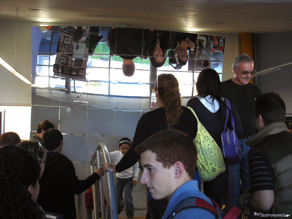 La visita comenzó con un paseo guiado por los diferentes relojes de Sol. Luego nos dirigimos al museo de ciencias donde pudimos ver, entre otras cosas, uno de los conjuntos de espejos que se utilizan en los telescopios de fluorescencia del Observatorio Pierre Auger. Ingresando al centro de visitantes un modelo de un dinosaurio depredador fue el motivo de varias fotografías.