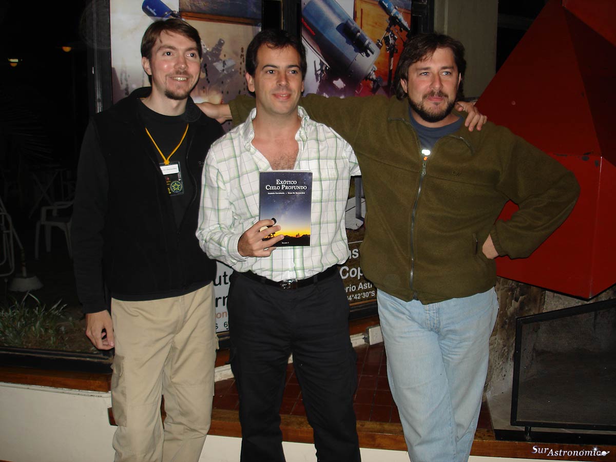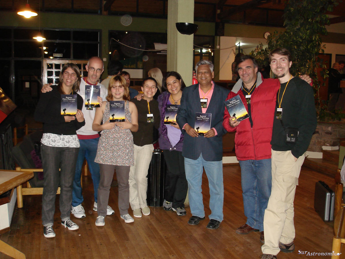 Luego, una imagen donde varios lectores tienen su ejemplar del libro de Exótico Cielo Profundo, un éxito aquí en la Star Party de Valle Grande. A la izquierda, Enzo De Bernardini, Rubén Barros y Rodolfo Ferraiuolo. A la derecha, de izquierda a derecha: Julieta De Simone Shecre, Sebastián Otero, Dolores García (a quien agradecemos especialmente), Lucía Arena, Carmen Arca, Subhash G. Gedam, Martín Mocellini y Enzo De Bernardini.