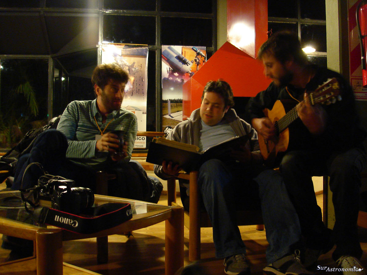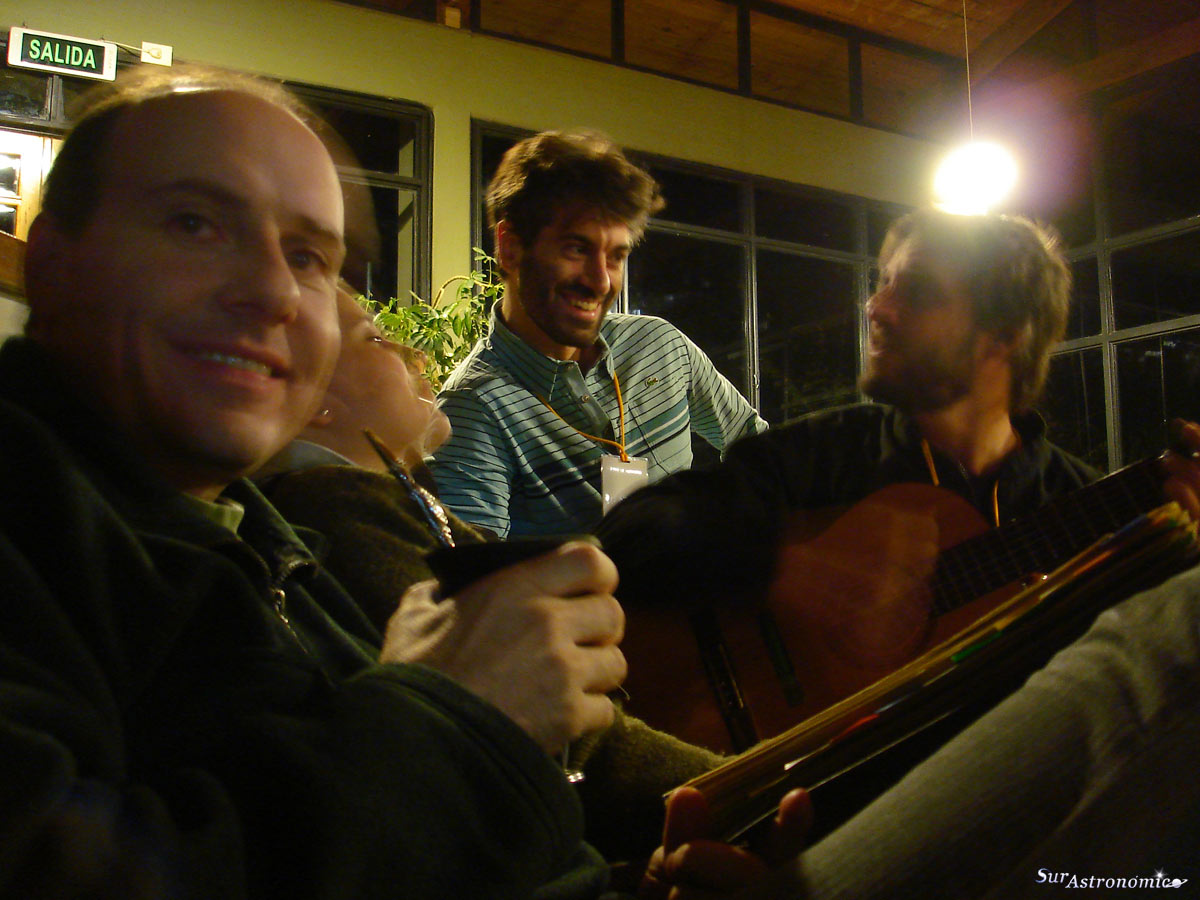 Luego de las observaciones del viernes, Marcelo Colucci nos deleitó con varios temas en guitarra. En la foto de la izquierda: Alejandro Tombolini, Lucía Arena, Andrés Vattuone y Marcelo Colucci. En la imagen de la derecha: Andrés Vattuone, Hernán Soulages y Marcelo Colucci