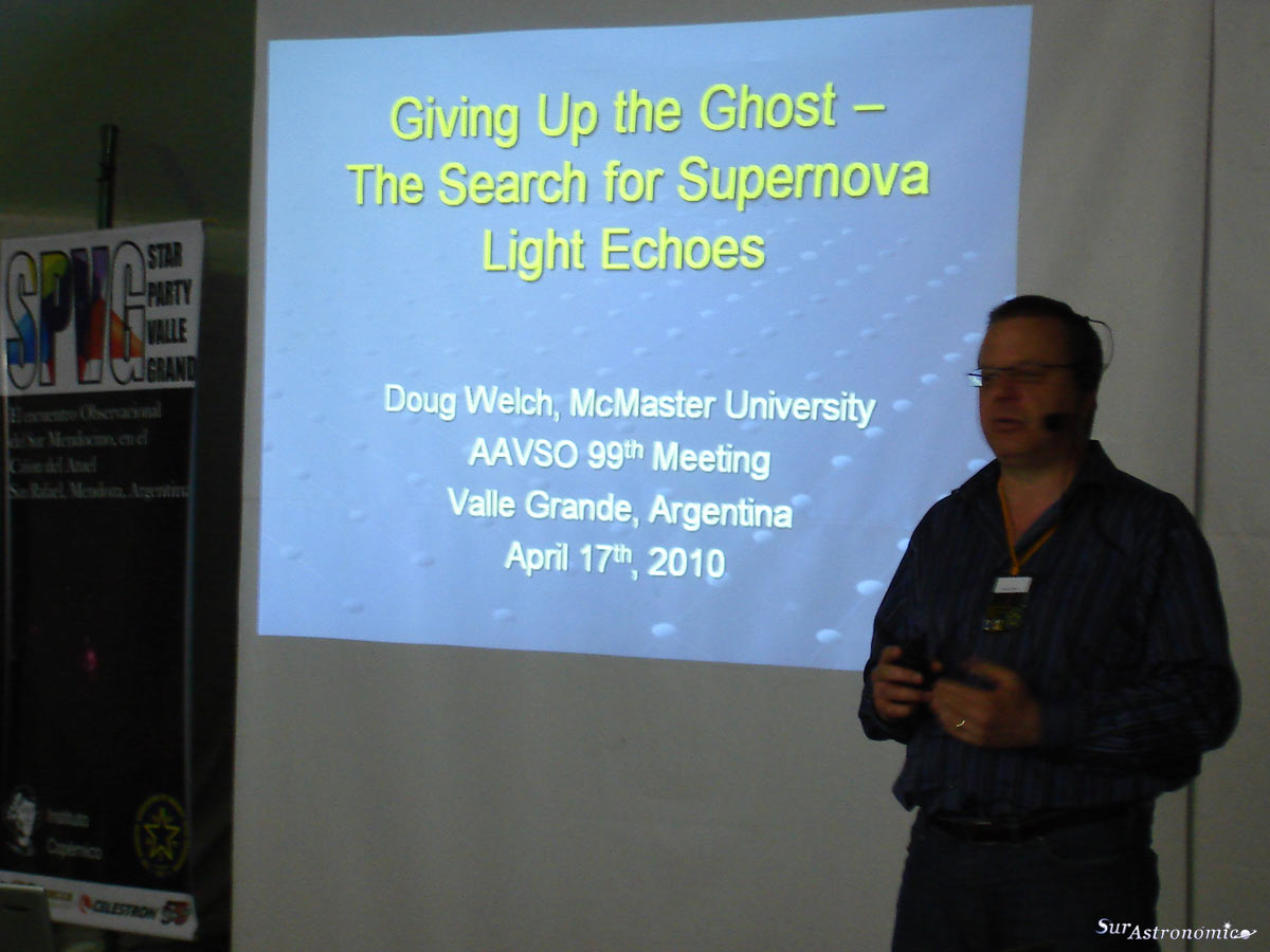 En la imagen de la izquierda, Sebastián Musso tratando el tema de didáctica en la enseñanza de la astronomía. A la derecha, Doug Welch con una interesante ponencia sobre la búsqueda de supernovas utilizando ecos de luz.