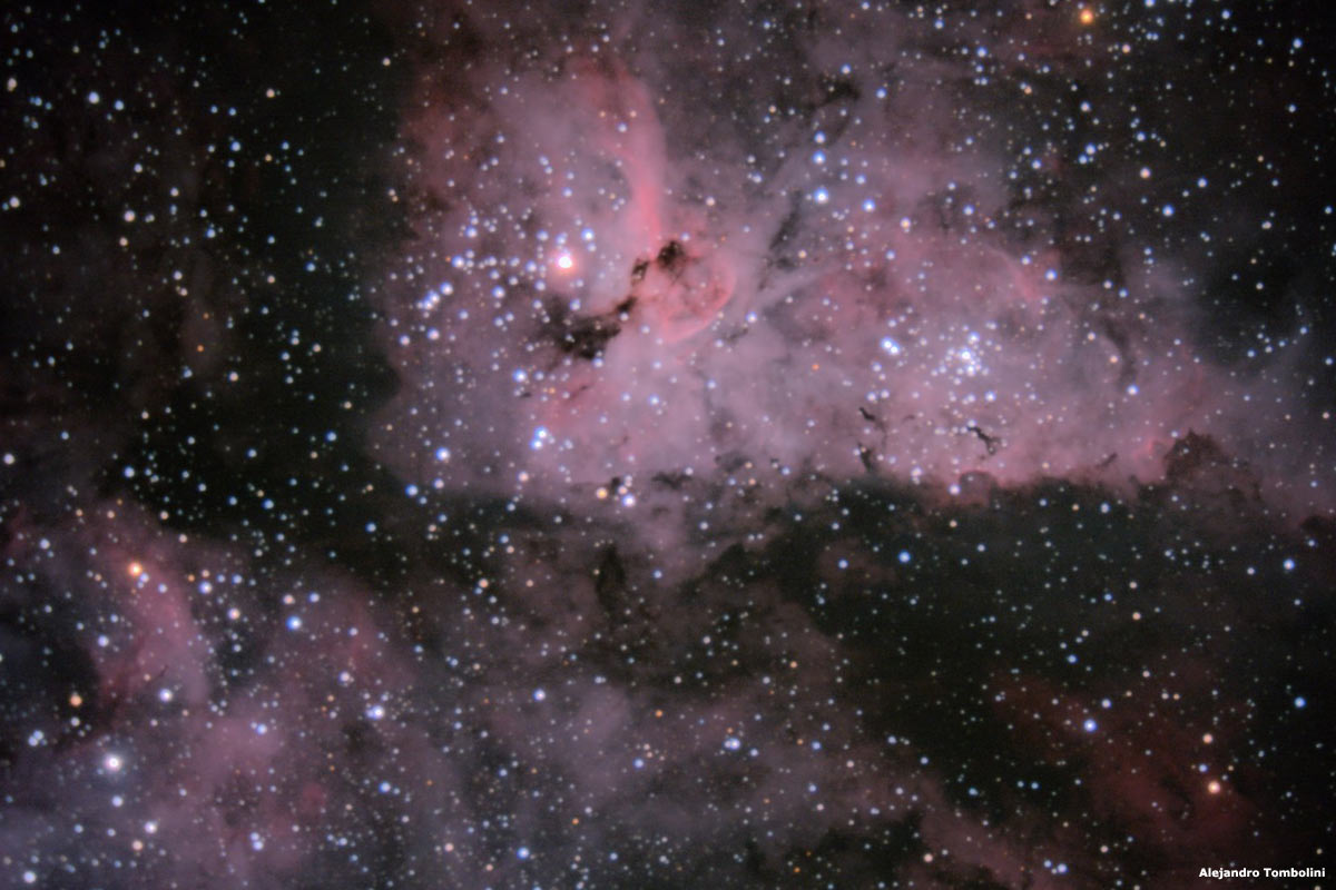 A la izquierda, una imagen de la nebulosa Eta Carinae, tomada por Alejandro Tombolini, utilizando una cámara Canon 450D en un telescopio Celestron Schmidt-Cassegrain de 11". A la derecha, una imagen nocturna capturada durante las observaciones, también de Alejandro Tombolini.