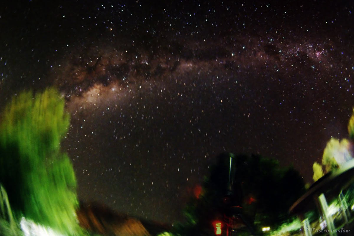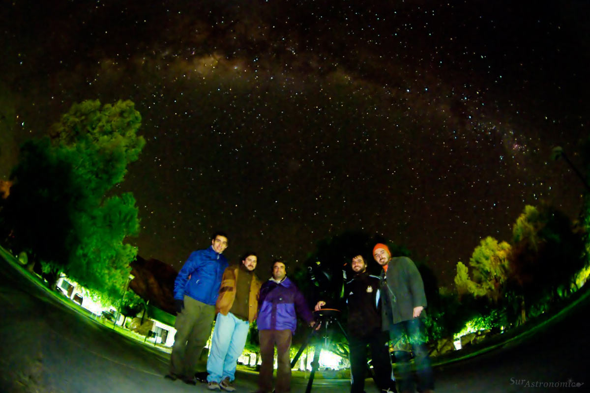 Dos imágenes logradas por Gastón Ferreirós, utilizando una cámara Nikon y un lente ojo de pez. A la izquierda: Gastón Ferreirós, Rodolfo Ferraiuolo, César Brollo, Marcelo Colucci y Martín Telechea. A la derecha, una vista de la Vía Láctea, desde el centro galáctico en Sagittarius hasta la zona del Saco de Carbón y eta Carinae.