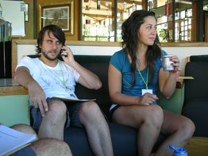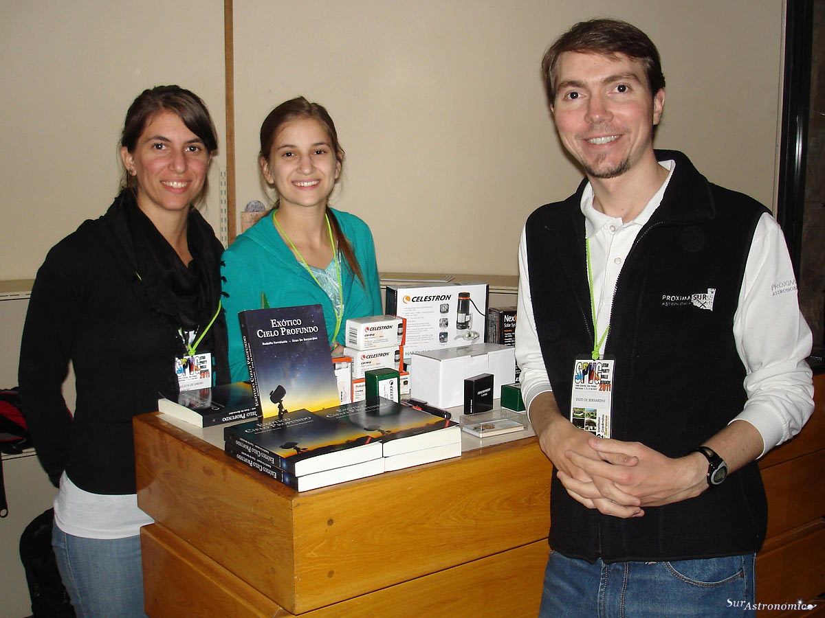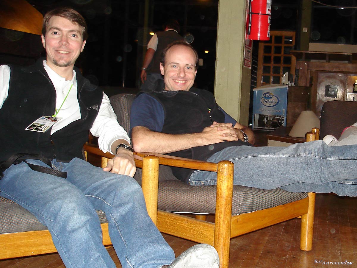 A la izquierda, luego de la cena, unos momentos de relax en el lobby del hotel antes de comenzar las observaciones nocturnas, en la foto: Enzo De Bernardini y Alejandro Tombolini. A la derecha, Julieta y Carolina De Simone Shecre junto a Enzo De Bernardini y el libro de Exótico Cielo Profundo.