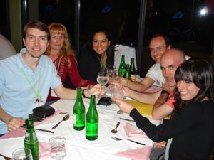 Cena del viernes. A la izquierda: Enzo De Bernardini, Mónica Rinaldi, Carmen Arca, Alejandro Tombolini, Sebastián Otero y Lucía Cabrera. A la derecha, Alejandro Tombolini.