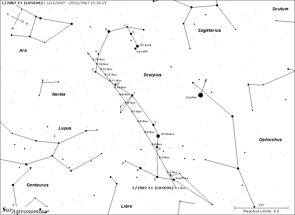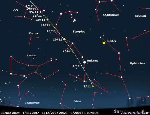 --------------------------------------------------------------------Fecha RA Dec Dis.T. Dis.S. El Mag -------------------------------------------------------------------- 01 Nov 2007 15h 53m 02.1s -15° 42' 28" 0.7391 0.4118 21.8 5.5 02 Nov 2007 16h 00m 54.5s -18° 43' 13" 0.7544 0.4184 22.9 5.6 03 Nov 2007 16h 08m 14.8s -21° 34' 12" 0.7727 0.4265 24.1 5.7 04 Nov 2007 16h 15m 03.0s -24° 14' 20" 0.7937 0.4361 25.3 5.9 05 Nov 2007 16h 21m 20.1s -26° 43' 07" 0.8170 0.4469 26.4 6.1 06 Nov 2007 16h 27m 07.4s -29° 00' 35" 0.8421 0.4590 27.5 6.2 07 Nov 2007 16h 32m 26.8s -31° 07' 05" 0.8686 0.4721 28.4 6.4 08 Nov 2007 16h 37m 20.4s -33° 03' 13" 0.8963 0.4862 29.3 6.6 09 Nov 2007 16h 41m 50.4s -34° 49' 43" 0.9249 0.5011 30.1 6.8 10 Nov 2007 16h 45m 59.0s -36° 27' 22" 0.9540 0.5167 30.7 7.0 11 Nov 2007 16h 49m 48.4s -37° 56' 58" 0.9836 0.5329 31.3 7.2 12 Nov 2007 16h 53m 20.6s -39° 19' 17" 1.0134 0.5496 31.8 7.4 13 Nov 2007 16h 56m 37.3s -40° 35' 03" 1.0433 0.5668 32.2 7.6 14 Nov 2007 16h 59m 40.5s -41° 44' 56" 1.0732 0.5844 32.6 7.8 15 Nov 2007 17h 02m 31.5s -42° 49' 31" 1.1031 0.6023 32.9 8.0 16 Nov 2007 17h 05m 11.8s -43° 49' 23" 1.1327 0.6205 33.1 8.2 17 Nov 2007 17h 07m 42.6s -44° 45' 00" 1.1621 0.6389 33.3 8.4 18 Nov 2007 17h 10m 05.0s -45° 36' 48" 1.1912 0.6575 33.5 8.6 19 Nov 2007 17h 12m 20.0s -46° 25' 12" 1.2200 0.6763 33.6 8.7 20 Nov 2007 17h 14m 28.5s -47° 10' 31" 1.2484 0.6952 33.7 8.9 21 Nov 2007 17h 16m 31.3s -47° 53' 04" 1.2765 0.7142 33.8 9.1 22 Nov 2007 17h 18m 29.0s -48° 33' 07" 1.3042 0.7332 33.9 9.2 23 Nov 2007 17h 20m 22.2s -49° 10' 55" 1.3314 0.7523 33.9 9.4 24 Nov 2007 17h 22m 11.5s -49° 46' 41" 1.3583 0.7715 34.0 9.5 25 Nov 2007 17h 23m 57.4s -50° 20' 37" 1.3847 0.7906 34.0 9.7 26 Nov 2007 17h 25m 40.2s -50° 52' 52" 1.4107 0.8098 34.0 9.8 27 Nov 2007 17h 27m 20.4s -51° 23' 36" 1.4362 0.8290 34.0 10.0 28 Nov 2007 17h 28m 58.3s -51° 52' 57" 1.4614 0.8482 34.0 10.1 29 Nov 2007 17h 30m 34.1s -52° 21' 03" 1.4861 0.8673 34.0 10.2 30 Nov 2007 17h 32m 08.1s -52° 48' 00" 1.5103 0.8864 34.1 10.4 01 Dic 2007 17h 33m 40.6s -53° 13' 54" 1.5341 0.9055 34.1 10.5 02 Dic 2007 17h 35m 11.7s -53° 38' 51" 1.5575 0.9245 34.1 10.6 03 Dic 2007 17h 36m 41.7s -54° 02' 56" 1.5805 0.9435 34.1 10.7 04 Dic 2007 17h 38m 10.6s -54° 26' 13" 1.6031 0.9625 34.2 10.9 05 Dic 2007 17h 39m 38.6s -54° 48' 45" 1.6252 0.9814 34.2 11.0 --------------------------------------------------------------------