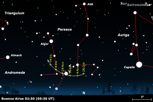 --------------------------------------------------------- Fecha Tránsito RA Dec Elong --------------------------------------------------------- 19 Nov 2007 00:27:58 03h 24m 32.3s +50° 11' 05" 149.1 20 Nov 2007 00:22:50 03h 23m 20.5s +50° 06' 29" 149.3 21 Nov 2007 00:17:44 03h 22m 09.5s +50° 01' 33" 149.4 22 Nov 2007 00:12:38 03h 20m 59.4s +49° 56' 18" 149.6 23 Nov 2007 00:07:34 03h 19m 50.2s +49° 50' 45" 149.7 24 Nov 2007 00:02:30 03h 18m 41.8s +49° 45' 03" 149.7 25 Nov 2007 23:52:26 03h 17m 35.0s +49° 38' 54" 149.7 26 Nov 2007 23:47:26 03h 16m 29.5s +49° 32' 28" 149.7 27 Nov 2007 23:42:28 03h 15m 25.3s +49° 25' 45" 149.6 28 Nov 2007 23:37:31 03h 14m 22.5s +49° 18' 46" 149.5 29 Nov 2007 23:32:36 03h 13m 21.3s +49° 11' 32" 149.4 30 Nov 2007 23:27:42 03h 12m 21.7s +49° 04' 04" 149.2 01 Dic 2007 23:22:50 03h 11m 23.7s +48° 56' 21" 148.9 02 Dic 2007 23:18:00 03h 10m 27.4s +48° 48' 26" 148.7 03 Dic 2007 23:13:12 03h 09m 33.0s +48° 40' 17" 148.4 04 Dic 2007 23:08:25 03h 08m 40.4s +48° 31' 57" 148.0 05 Dic 2007 23:03:41 03h 07m 49.8s +48° 23' 25" 147.6 06 Dic 2007 22:58:59 03h 07m 01.1s +48° 14' 43" 147.2 07 Dic 2007 22:54:18 03h 06m 14.5s +48° 05' 51" 146.8 08 Dic 2007 22:49:40 03h 05m 29.9s +47° 56' 50" 146.3 09 Dic 2007 22:45:04 03h 04m 47.5s +47° 47' 41" 145.8 10 Dic 2007 22:40:30 03h 04m 07.1s +47° 38' 24" 145.3 11 Dic 2007 22:35:58 03h 03m 29.0s +47° 29' 00" 144.8 12 Dic 2007 22:31:28 03h 02m 53.0s +47° 19' 31" 144.2 13 Dic 2007 22:27:01 03h 02m 19.2s +47° 09' 56" 143.6 14 Dic 2007 22:22:36 03h 01m 47.7s +47° 00' 16" 143.0 15 Dic 2007 22:18:13 03h 01m 18.4s +46° 50' 32" 142.4 16 Dic 2007 22:13:52 03h 00m 51.4s +46° 40' 44" 141.7 17 Dic 2007 22:09:33 03h 00m 26.6s +46° 30' 54" 141.1 18 Dic 2007 22:05:17 03h 00m 04.0s +46° 21' 02" 140.4 19 Dic 2007 22:01:03 02h 59m 43.8s +46° 11' 09" 139.7 20 Dic 2007 21:56:51 02h 59m 25.7s +46° 01' 14" 139.0 21 Dic 2007 21:52:41 02h 59m 09.9s +45° 51' 19" 138.3 22 Dic 2007 21:48:34 02h 58m 56.3s +45° 41' 25" 137.5 23 Dic 2007 21:44:29 02h 58m 44.9s +45° 31' 31" 136.8 24 Dic 2007 21:40:25 02h 58m 35.7s +45° 21' 38" 136.1 25 Dic 2007 21:36:24 02h 58m 28.7s +45° 11' 47" 135.3 26 Dic 2007 21:32:26 02h 58m 23.8s +45° 01' 58" 134.5 27 Dic 2007 21:28:29 02h 58m 21.0s +44° 52' 12" 133.8 ---------------------------------------------------------