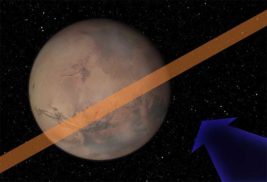 La imagen simulada inferior muestra en naranja la franja con la posible área donde el asteroide 2007 WD5 podría estar el 30 de Enero de 2008. La flecha azul indica la dirección de la trayectoria. Marte podría, o no, quedar dentro del camino del objeto.