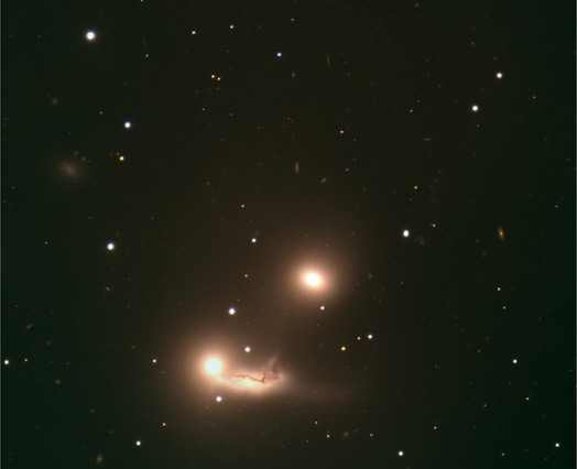 Una nueva imagen de los Very Large Telescope (ESO) revela un triplete de galaxias unidas en una danza cósmica. Se trata de NGC 7173, NGC 7174 y NGC 7176, localizadas en la constelación de Pisces Austrinus. NGC 7173 y NGC 7174 son dos galaxias elípticas, mientras que NGC 7176 es una galaxia espiral, con líneas de polvo muy distorsionadas, con colas retorcidas.