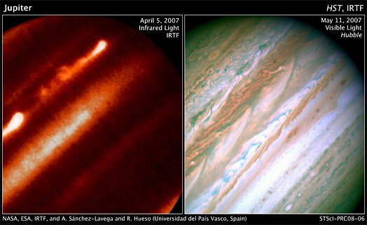 Detallados análisis realizados por el Telescopio Espacial Hubble de dos tormentas del tamaño de un continente en la atmósfera de Júpiter en Marzo de 2007 muestran que el calor interno juega un papel significativo en la generación de disturbios atmosféricos. Entender estos procesos puede ser la clave para develar los misterios de las profundidades de la atmósfera del planeta gigante.