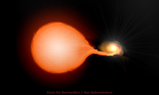 El sistema de la nova denominada RS Ophiuchi se compone de una estrella enana blanca y una estrella gigante roja. La gigante roja transfiere gradualmente gas de sus capas externas a la enana blanca, haciendo que la masa de esta vaya creciendo gradualmente. Al acumularse materia en la superficie de la estrella la temperatura va en aumento hasta alcanzar un punto crítico, donde se enciende en forma de explosión termonuclear que causa el gran abrillantamiento observado en el sistema. RS Ophiuchi llegó a este punto en los años 1898, 1933, 1958, 1967, 1985 y 2006.