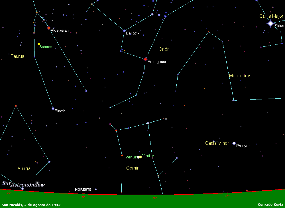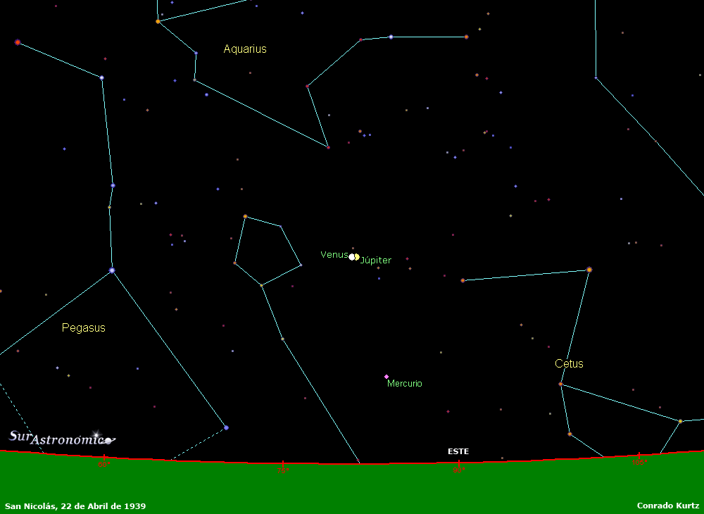 Hace un tiempo atrás llegó una consulta de la profesora Karina Madariaga, de la localidad bonaerense de San Nicolás, acerca de la posibilidad de que un suceso astronómico inspirara a un poeta local. Se trata del poema "Otoño color naranja" de Astul Urquiaga, y en éste se menciona "los dos luceros del alba". La pregunta es entonces si el poeta observó una conjunción entre los planetas Venus (el llamado "Lucero" y más brillante de los planetas visibles a simple vista) y Júpiter, de brillo algo menor que Venus y color semejante. La publicación de estos versos data de 1943 y la conjunción matutina más próxima en el tiempo tuvo lugar el 2 de Agosto de 1942. Si bien este evento astronómico tuvo lugar en Invierno, el poeta bien pudo tomarse una licencia o tal vez la observación ocurrió con mayor anterioridad. De ser así, la siguiente conjunción matinal otoñal de estos dos astros fue el 22 de Abril de 1939. En ambas ocasiones estuvieron separados algo menos de medio grado (equivalente a un diámetro lunar).