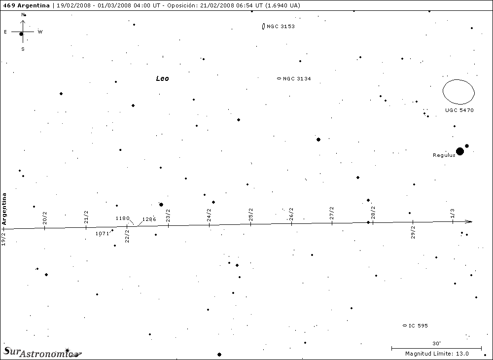 El asteroide 469 Argentina estará en oposición con el Sol el 21 de Febrero a las 06:54 UT, brillando con magnitud +12 a 2º de Regulus (alpha Leonis) en Leo.