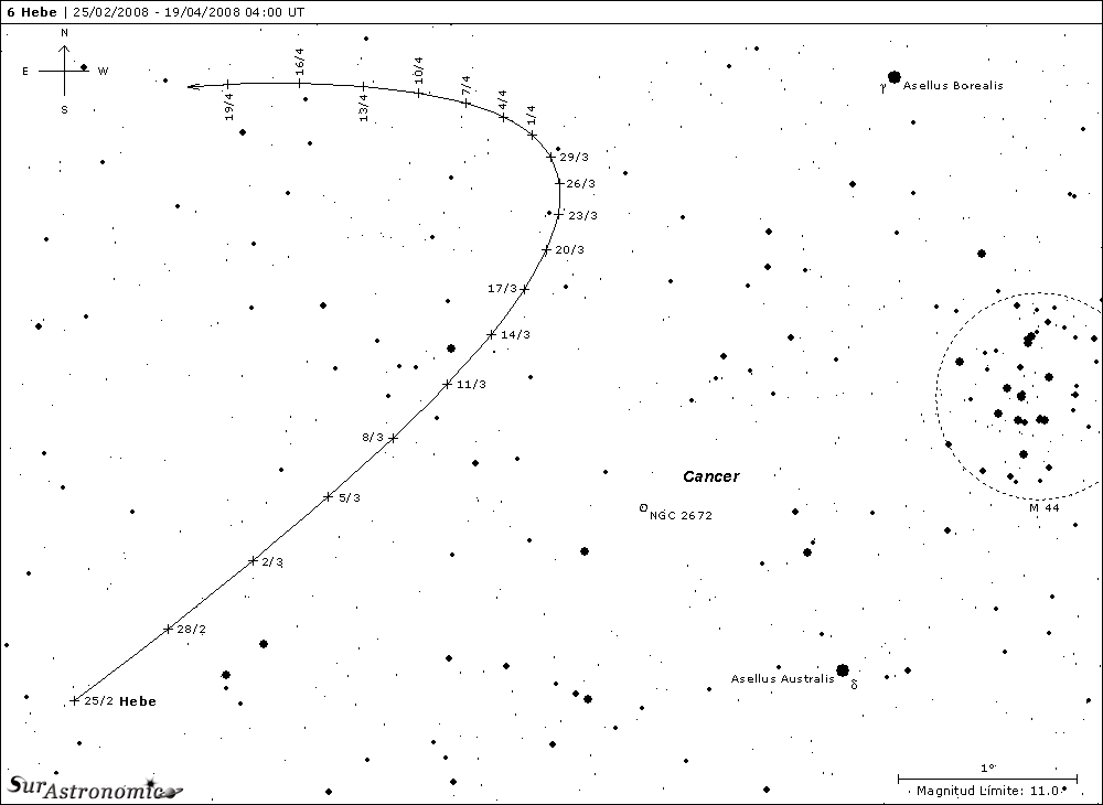 El asteroide 6 Hebe se estará moviendo en la constelación de Cancer, al Este del cúmulo abierto M 44 (Praesepe), rondando la magnitud 6.5 hasta mediados del mes de Marzo. Este asteroide pertenece al cinturón de asteroides entre la órbita de Marte y Júpiter, fue descubierto por Karl L. Hencke el 1 de Julio de 1847 y posee un tamaño estimado de 205x185x170 kilómetros.