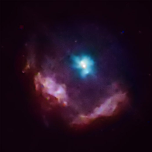 Una imagen profunda del telescopio espacial de rayos-x Chandra muestra al remanente de supernova Kes 75, localizado a unos 20000 años luz del Sol, el cual fue creado por la explosión de una estrella masiva dejando en su lugar un púlsar (una estrella de neutrones en rápida rotación)